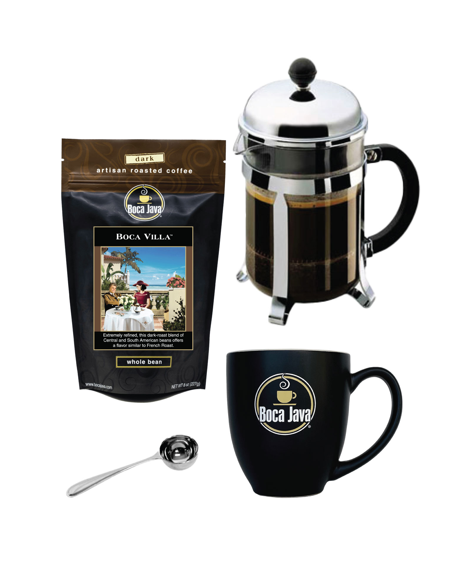French Press Coffee Kit Gift Set is a great gift for anyone looking to enjoy gourmet coffee in a leisurely and more controlled fashion at home. It includes a Bodum French Press, one 8oz bag of coffee, a Boca Java Mug and a stainless steel coffee scoop. Read More